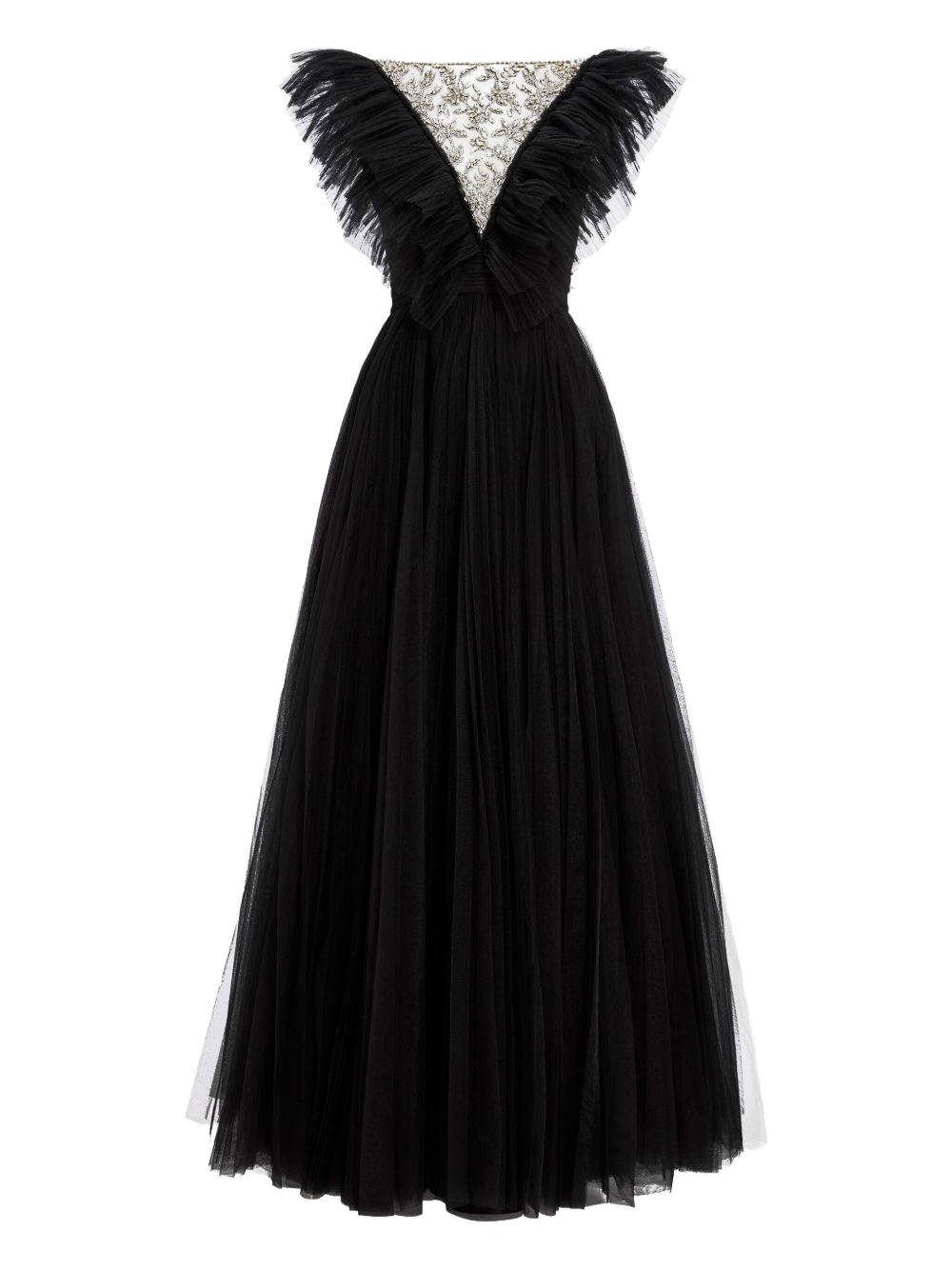 embellished ruffled-tulle maxi dress Highlights - Black - Crystal embellishment - Pleated ruffles - V-neck - Sleeveless - A-line skirt Imported Composition Polyester 100% Washing instructions Read Manufacturer Guidelines