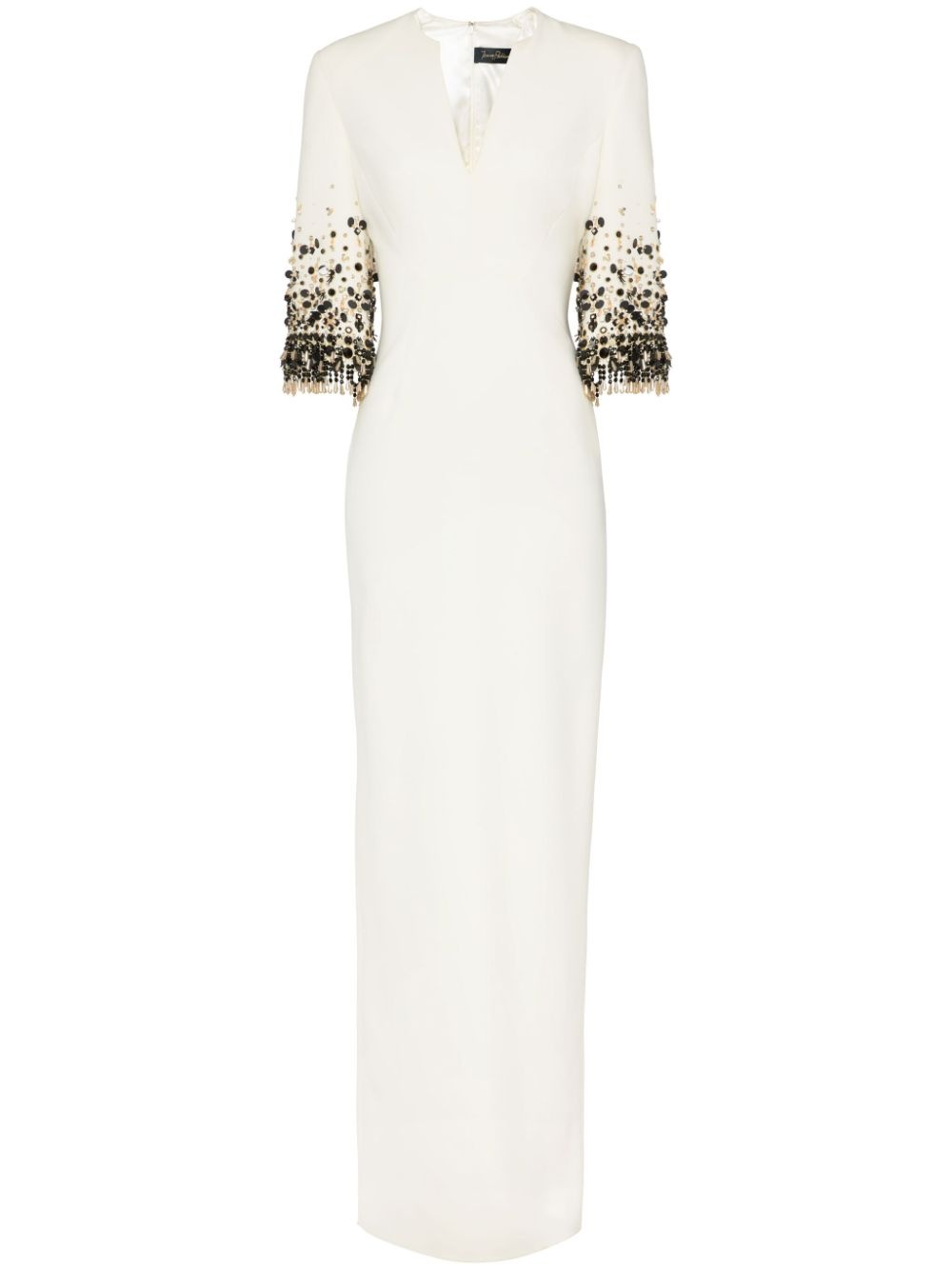 Ruth gown dress Highlights - White - Crepe texture - Concealed rear zip fastening - V-neck - Half-length sleeves - Crystal embellishment - Rear slit - Long length Imported Composition Polyester 100%