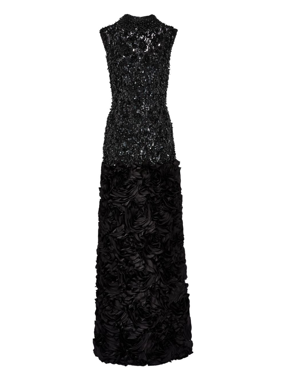 sequin-embellishment ruffle maxi dress Highlights - Black - Sequin embellishment - Mock neck - Sleeveless - Rose ruffle detail Imported Composition Nylon 100% Washing instructions Read Manufacturer Guidelines