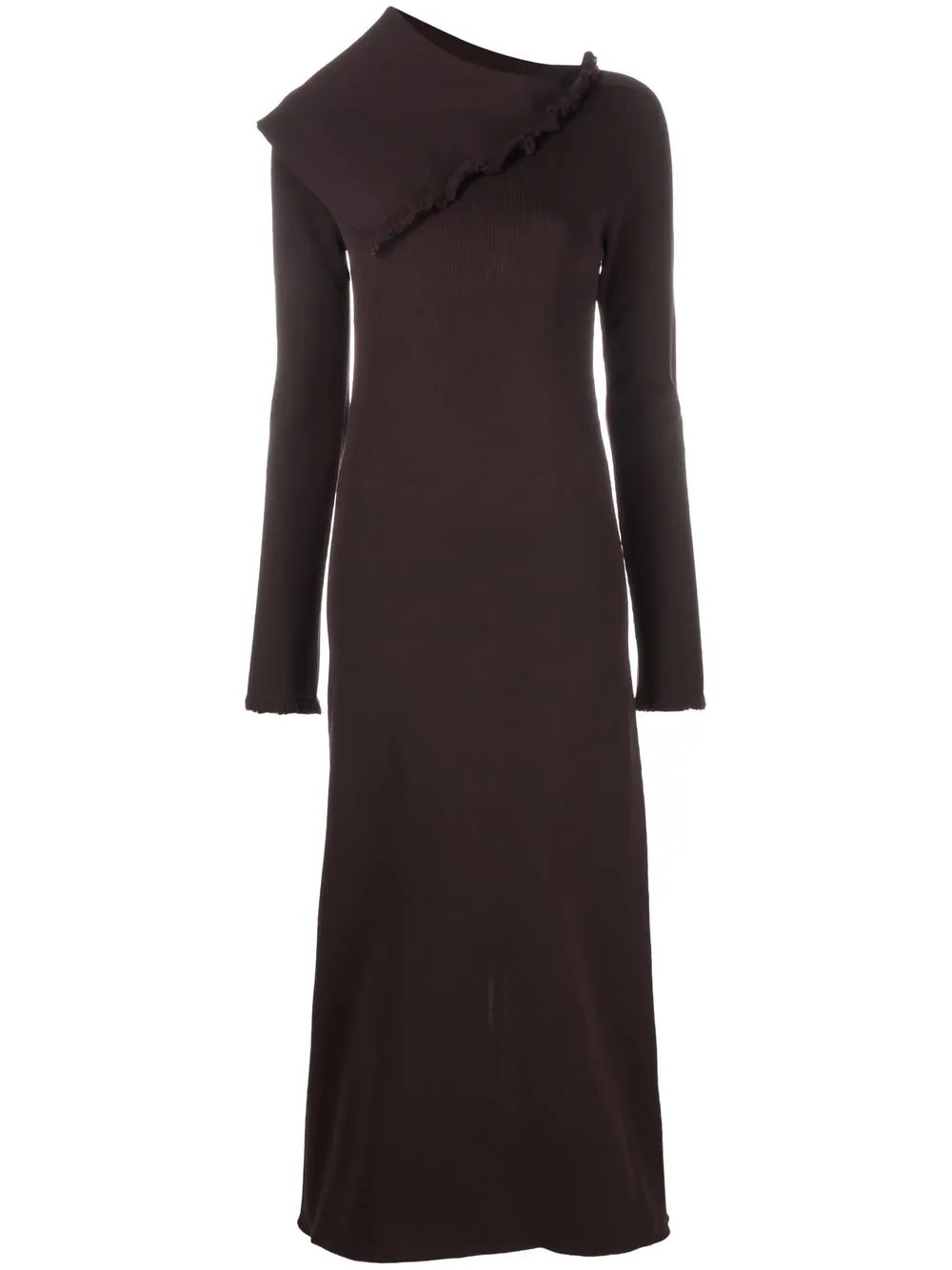 asymmetric collar maxi dress dark brown asymmetric collar ruffled detailing round neck long sleeves straight hem Made in Italy Composition Polyamide 100% SIZE & FIT Model measurements Height 5 ft 9 in(1.76 m) Bust/Chest 33.07 in(84 cm) Hips 34.64 in(88 cm) Waist 25.59 in(65 cm) FittingInformation This piece fits true to size. We recommend you get your regular size Designed for a close fit at the bust, waist and hips Made with a mid-weight fabric Washing instructions Dry Clean Only