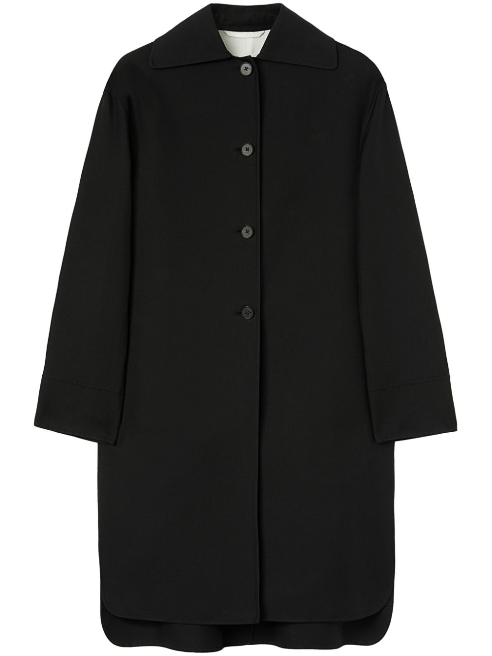 asymmetric-hem cotton coat Jil Sander showcases its understated elegance through the simplicity of this single-breasted coat. It's cut from black cotton with a spread collar and curved, high-low hem for a contemporary twist. Highlights - Black - Cotton - Cutaway collar - Front button fastening - Long sleeves - Asymmetric edge Made in Italy Composition Outer: Cotton 100% Lining: Viscose 100% SIZE & FIT Model measurements Height 5 ft 10 in(1.78 m) Bust/Chest 29.92 in(76 cm) Hips 34.64 in(88 cm) Waist 23.62 in(60 cm) FittingInformation Designed for an oversized fit, offering additional room throughout