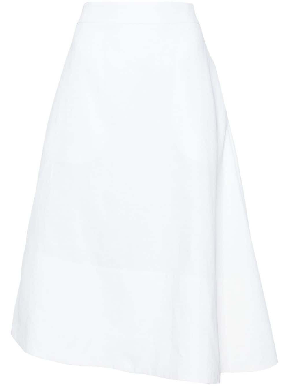 asymmetric linen midi skirt Highlights - White - Linen - Slub texture - High waist - Concealed side hook and zip fastening - Two side slit pockets - A-line skirt - Flared - Mid-length - Asymmetric hem - Unlined Made in Italy Composition Linen/Flax 100% SIZE & FIT Model measurements Height 5 ft 10 in(1.77 m) Bust/Chest 32.28 in(82 cm) Hips 35.03 in(89 cm) Waist 25.19 in(64 cm) FittingInformation Designed with an asymmetric hem, this skirt is intended to be worn just below the waist Made from a midweight non-stretch fabric This piece fits true to size – take your usual size