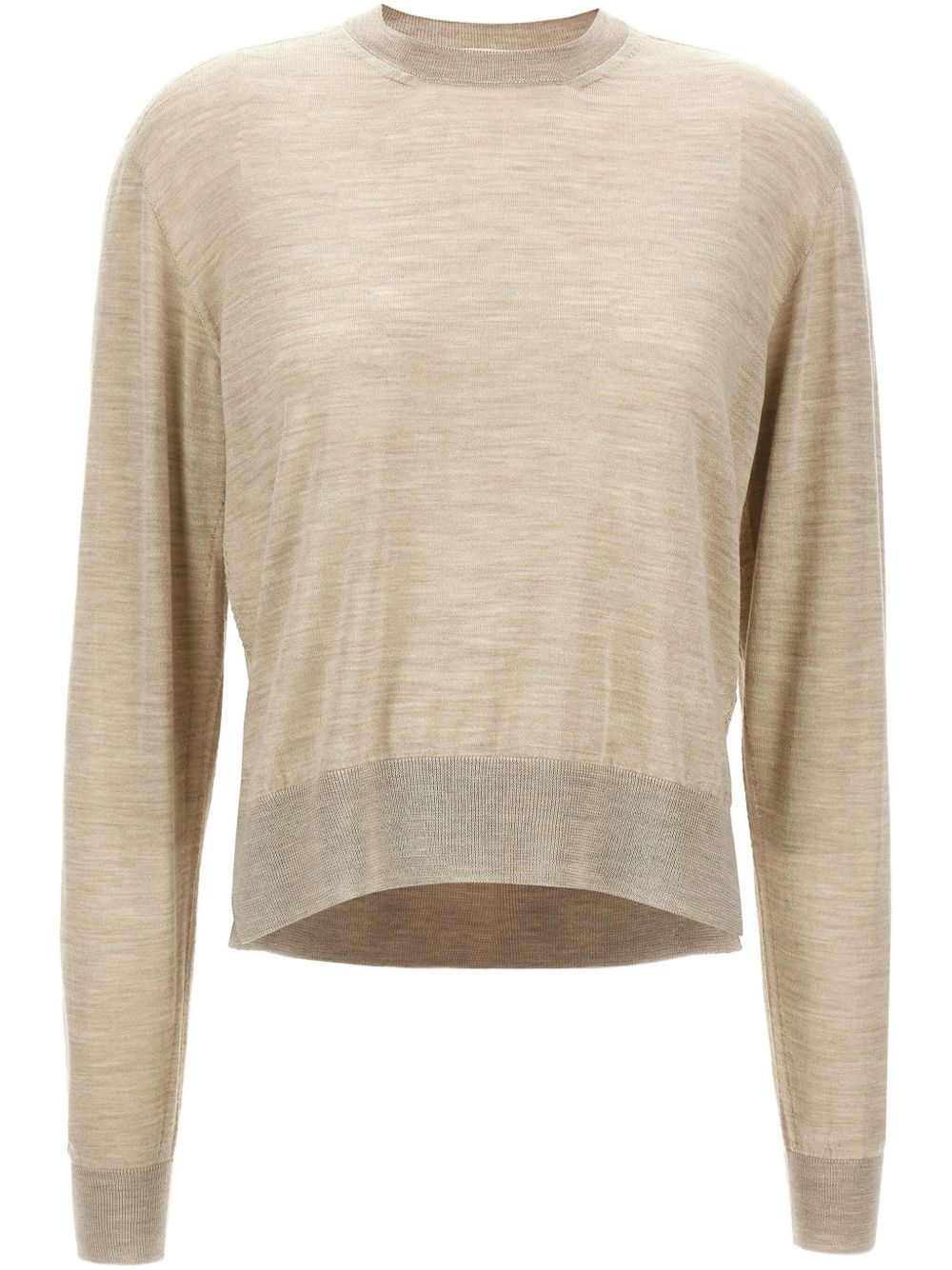 asymmetrical sweater Highlights - Sesame beige - Short side slits - Crew neck - Long sleeves - Ribbed cuffs and hem Made in Italy Composition Virgin Wool 35%, Cashmere 35%, Silk 30%