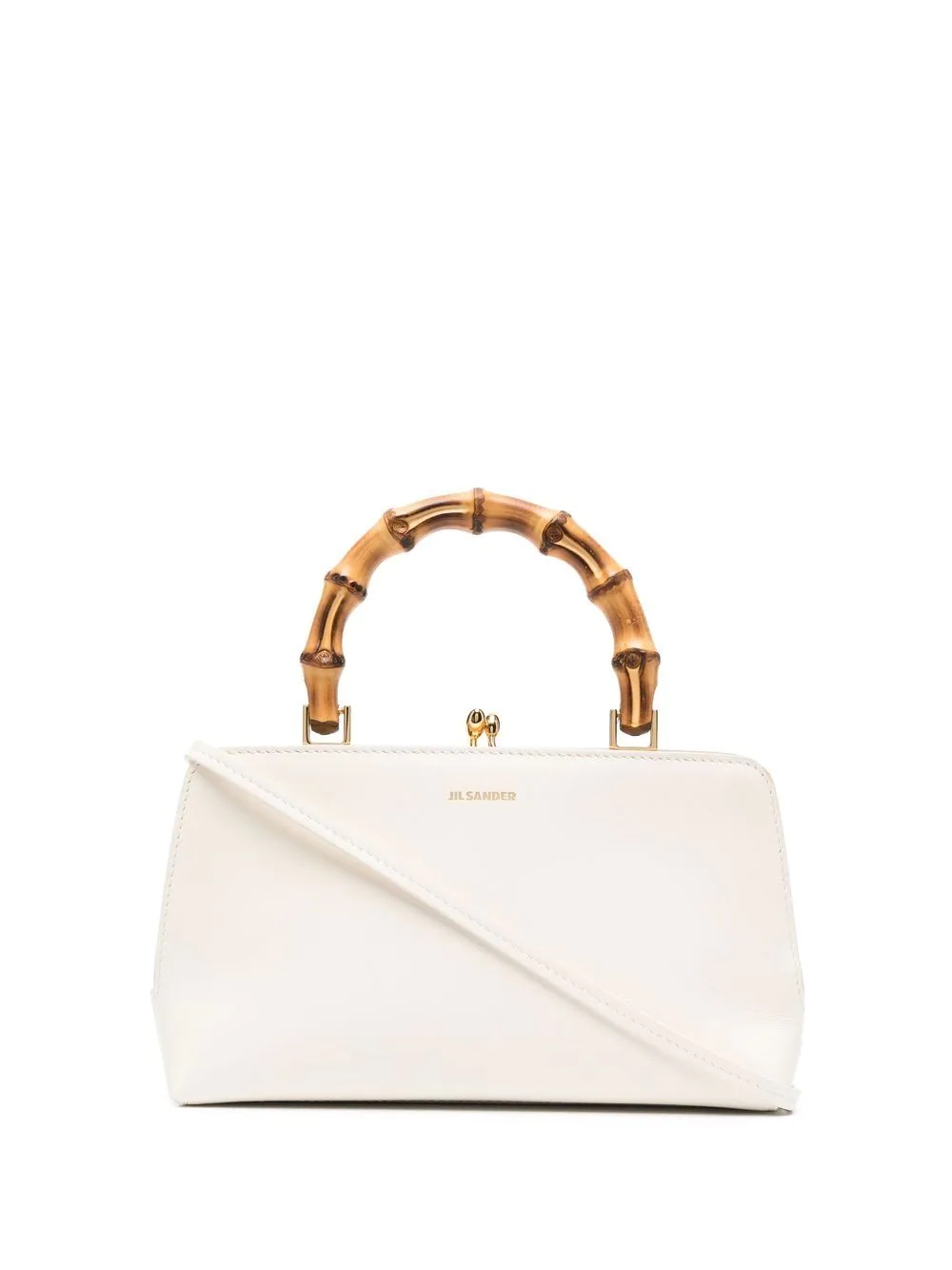 bamboo-handle leather tote bag This Jil Sander tote bag is defined by its bamboo top handle, while a logo stamp decorates the front. Highlights - Latte - Calf leather - Gold-tone logo lettering - Signature bamboo top handle - Gold-tone clasp fastening - Main compartment - Internal zip-fastening pocket Made in Italy Composition Outer: Calf Leather 100% SIZE & FIT Model measurements Height 5 ft 10 in(1.78 m) Bust/Chest 31.49 in(80 cm) Hips 36.22 in(92 cm) Waist 25.59 in(65 cm) Measurement DEPTH 2.36 in(6 cm) HANDLE 3.14 in(8 cm) HEIGHT 4.72 in(12 cm) STRAP 21.65 in(55 cm) WIDTH 8.66 in(22 cm)