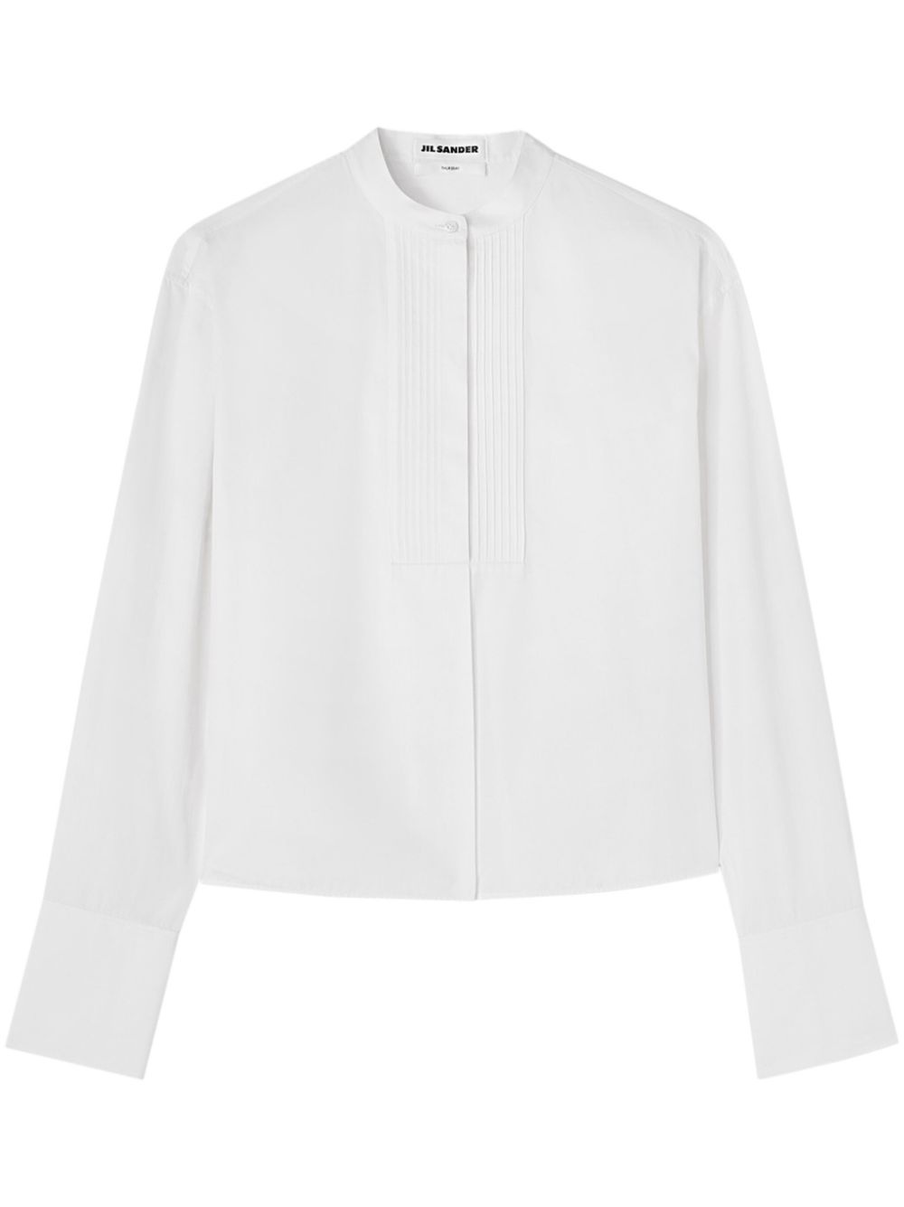 band-collar cotton shirt Cut from crisp white cotton, this Jil Sander shirt stands out with its minimalism. It is a collarless design and features pleating on the chest for added texture. Made in Italy Composition Cotton 100% SIZE & FIT Model measurements Height 5 ft 10 in(1.78 m) Bust/Chest 31.49 in(80 cm) Hips 35.03 in(89 cm) Waist 23.62 in(60 cm) FittingInformation This piece fits true to size. We recommend you get your regular size Cut for a loose fit Made with a mid-weight non-stretch fabric Washing instructions Dry Clean Only