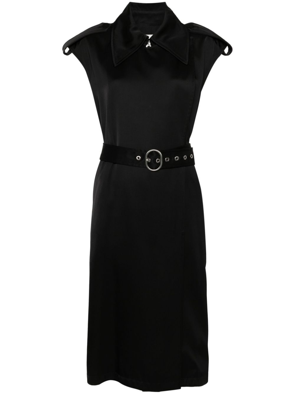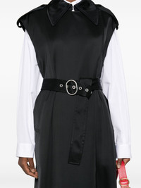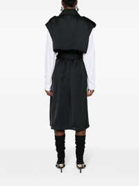 belted trench coat Highlights - Black - Twill weave - Oversized pointed collar - Sleeveless - Two side welt pockets - Storm flap - Detachable waist belt - Full lining - Central rear vent - Front button fastening Made in Italy Composition Lining: Viscose 100% Outer: Viscose 83%, Silk 17% SIZE & FIT Model measurements Height 5 ft 10 in(1.78 m) Bust/Chest 31.49 in(80 cm) Hips 37 in(94 cm) Waist 23.62 in(60 cm) FittingInformation Designed to be unstructured, offering a loose fit throughout The belt offers adjustability for fitted preferences Made from a midweight non-stretch fabric This piece fits true to size – take your usual size