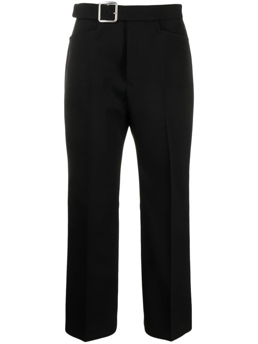 buckled pleated flared wool trousers For Jil Sander’s AW23 collection Lucie and Luke Meier draw inspiration from their formative years in the ’90s and 2000s. Evocative of both the era and the brand’s signature minimalism, these black trousers are topped with an asymmetric silver-tone buckle – a recurring detail throughout the season. Single pleats at the thighs extend seamlessly into pressed creases through the cropped, flared leg. Highlights - Black - Wool - Buckle fastening - Pleat detailing - Mid-rise - Concealed front fastening - Two diagonal pockets to the sides - Silver-tone hardware - Rear welt pocket - Cropped - Flared - Cotton lining Made in Italy Composition Lining: Cotton 100% Outer: Wool 100% SIZE & FIT Model measurements Height 5 ft 11 in(1.8 m) Bust/Chest 34.25 in(87 cm) Hips 35.82 in(91 cm) Waist 24.8 in(63 cm) FittingInformation Designed with a flared hem, these trousers allow for a close fit at the waist with a slim fit over the leg and widening towards the hem Cropped in length Made from a midweight non-stretch fabric This piece fits true to size – take your usual size Washing instructions Dry Clean Only