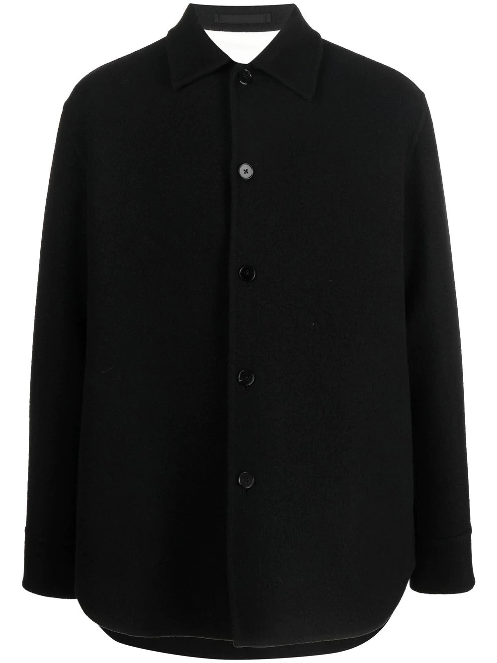 button-up wool shirt jacket black virgin wool/silk front button fastening classic collar long sleeves buttoned cuffs curved hem Made in Italy Composition Lining: Silk 100% Outer: Virgin Wool 100% SIZE & FIT Model measurements Height 6 ft 2 in(1.87 m) Bust/Chest 36.41 in(92.5 cm) Hips 37 in(94 cm) Waist 29.52 in(75 cm) FittingInformation Designed to be unstructured, offering a loose fit throughout Made from a midweight non-stretch fabric This piece fits true to size – take your usual size Washing instructions Dry Clean Only