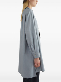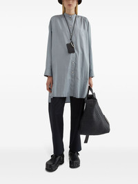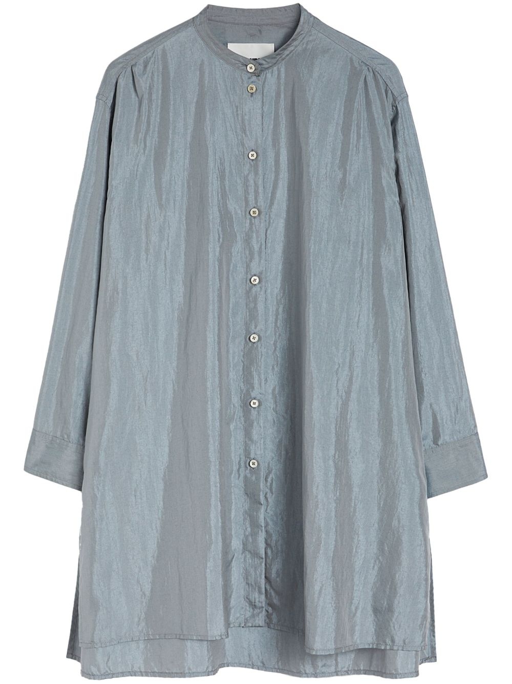 buttoned long shirt Highlights - Pewter blue - Polyamide/silk blend - Buttoned band collar - Front button fastening - Long sleeves - Buttoned cuffs - Side slits - Pleat detailing - Internal logo patch Made in Italy Composition Polyamide 64%, Silk 36% SIZE & FIT FittingInformation Designed for an oversized fit, offering additional room throughout Made from a lightweight non-stretch fabric