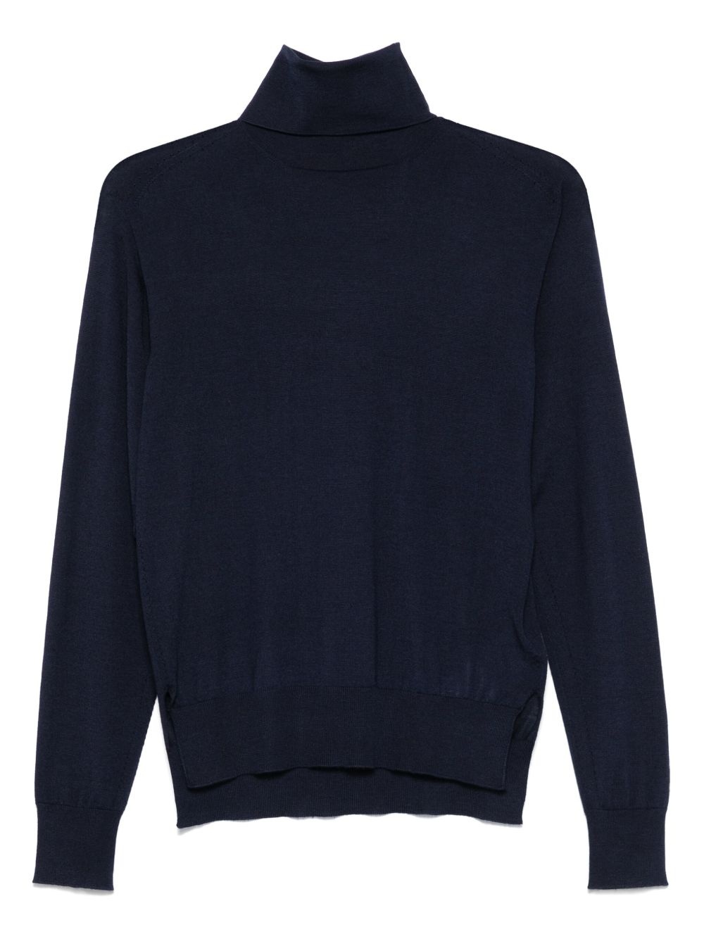 cashmere-blend jumper Highlights - Midnight blue - Turtleneck neckline - Long sleeves - Ribbed cuffs - Ribbed hem Made in Italy Composition Cashmere 35%, Virgin Wool 35%, Silk 30% SIZE & FIT Model measurements Height 5 ft 10 in(1.78 m) Bust/Chest 31.49 in(80 cm) Hips 37 in(94 cm) Waist 23.62 in(60 cm) FittingInformation Designed for a relaxed fit, this piece allows for comfort and movement when worn Made with a lightweight knit, this piece offers some stretch Washing instructions Dry Clean Only