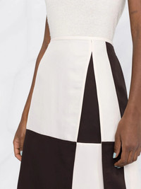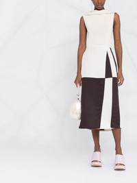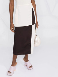 colour-block midi skirt Jil Sander's minimalist style is showcased with this colour-block skirt. Produced in a brown and white panelled design, the silk-blend piece falls to a mid length for an elegant silhouette. Made In Italy Composition Viscose 67%, Silk 33% SIZE & FIT Model measurements Height 5 ft 10 in(1.78 m) Bust/Chest 31.49 in(80 cm) Hips 37 in(94 cm) Waist 23.62 in(60 cm) FittingInformation This piece fits true to size. We recommend you get your regular size Designed to be fitted at the waist and hips, loose over the leg Made with a mid-weight non-stretch fabric Washing instructions Dry Clean Only