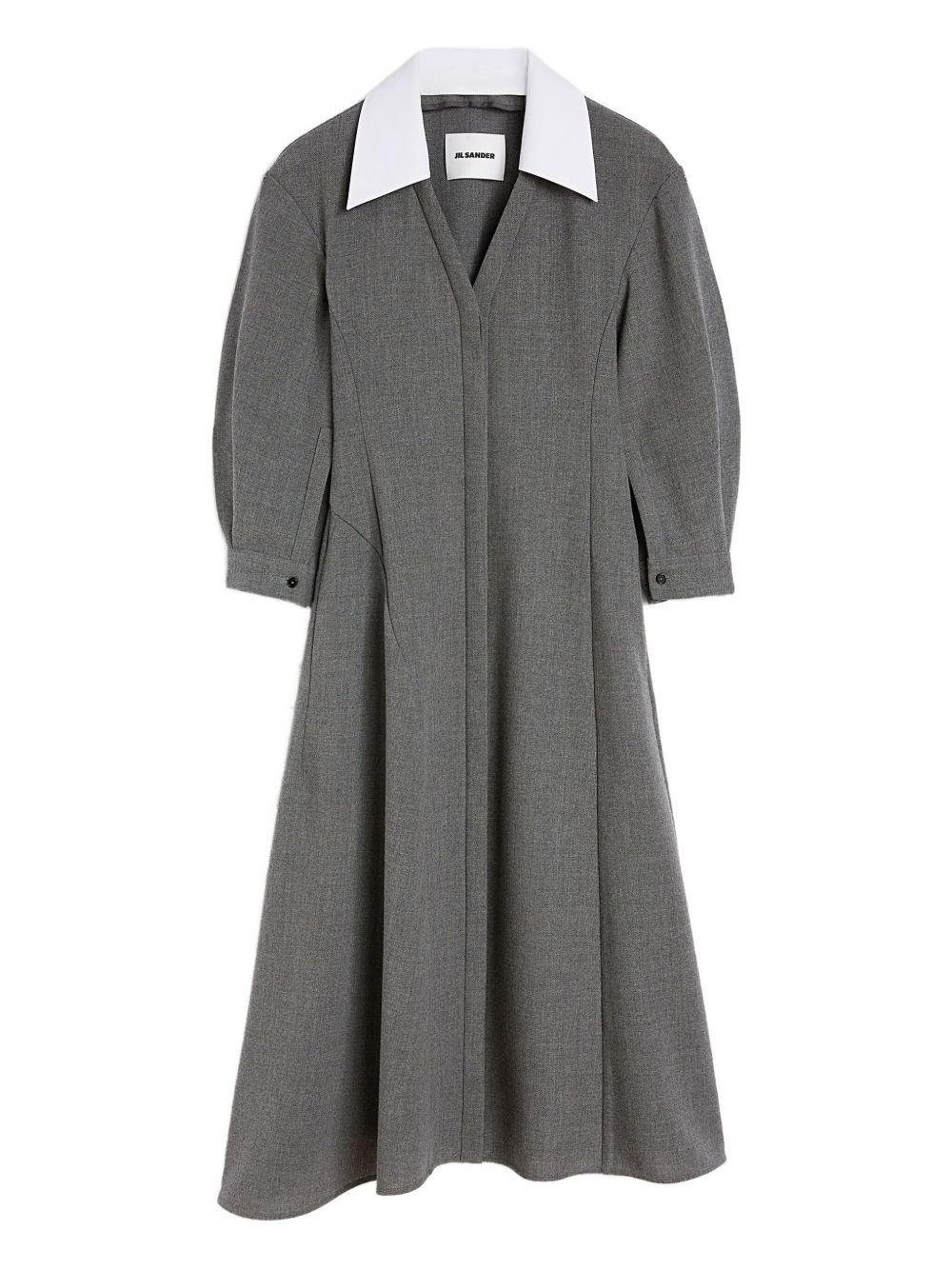 contrasting-collar midi dress Highlights - Medium grey - Concealed front button fastening - Detachable collar - Buttoned cuffs - Asymmetric hem Made in Italy Composition Wool 100% SIZE & FIT Measurement HIPS 40.15 in(102 cm) LENGTH 48.81 in(124 cm) WAIST 29.13 in(74 cm) BUST 31.49 in(80 cm) Shoulder Width 18.11 in(46 cm) Washing instructions Read Manufacturer Guidelines