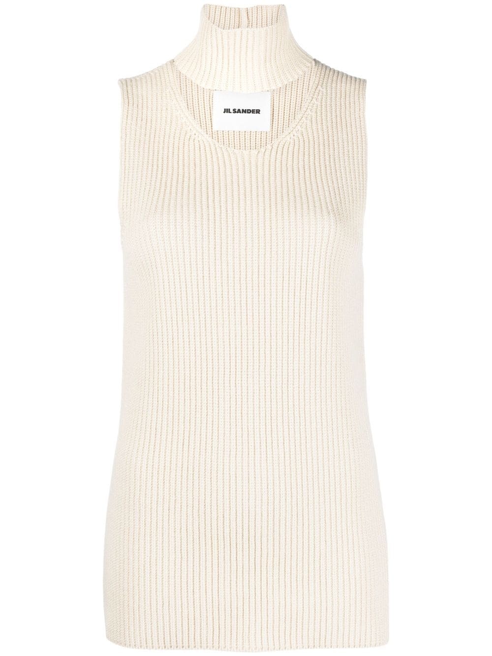 cut-out knitted sweater vest Spun from cotton blend to a ribbed-knit construction, this beige sweater vest speaks to Jil Sander’s penchant for minimalism with a twist. It’s punctuated by a curved cut-out at the neck. Highlights - Light beige - Cotton blend - Ribbed knit - Cut-out detailing - High neck - Sleeveless Made in Italy Composition Cotton 58%, Polyester 42% SIZE & FIT Model measurements Height 5 ft 10 in(1.78 m) Bust/Chest 30.7 in(78 cm) Hips 34.64 in(88 cm) Waist 23.22 in(59 cm) FittingInformation Designed for a relaxed fit, this piece allows for comfort and movement when worn Made with a midweight knit, this piece offers some stretch This piece fits true to size – take your usual size Washing instructions Dry Clean Only