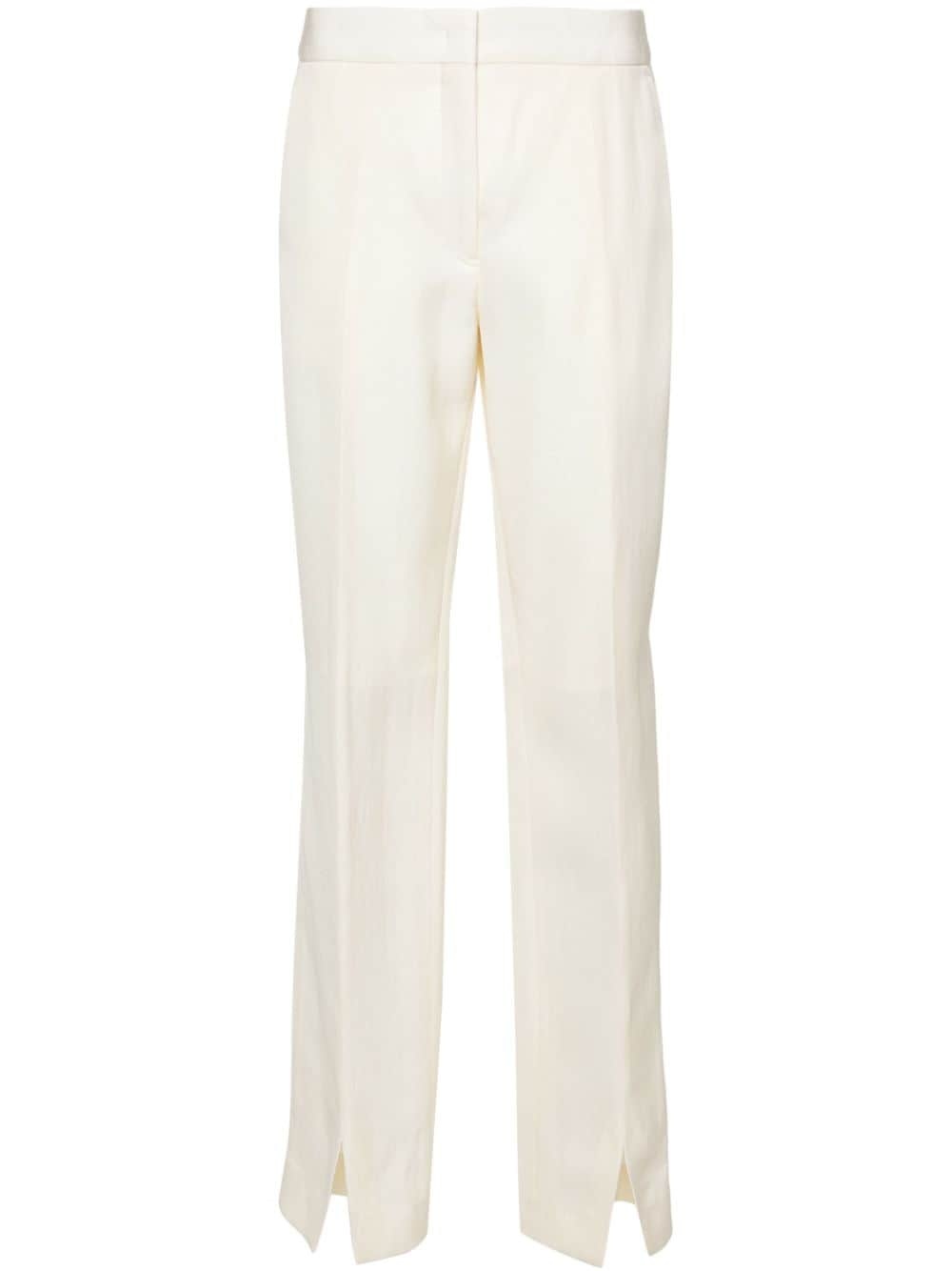 dart-detailing trousers Highlights - Cream white - Slub texture - Pressed crease - Dart detailing - Slit detailing - Two diagonal pockets to the sides - Two rear welt pockets - Concealed front button, hook and zip fastening Made in Italy Composition Outer: Viscose 58%, Silk 42% Lining: Cotton 100%, Viscose 100% Washing instructions Dry Clean Only