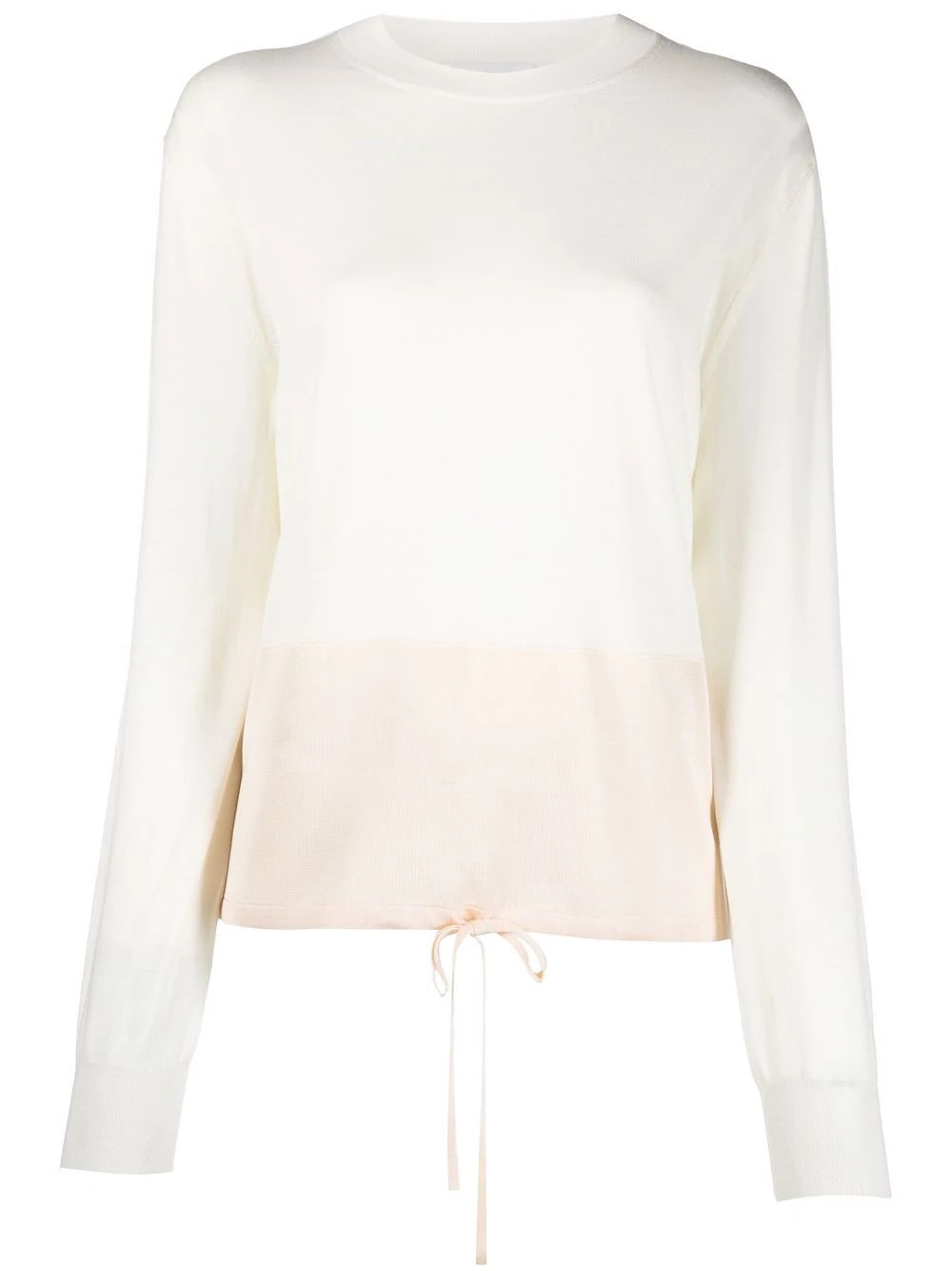 drawstring fine-knit jumper cream virgin wool fine knit drawstring fastening round neck long sleeves straight hem Made in Italy Composition Virgin Wool 68%, Viscose 32% SIZE & FIT Model measurements Height 5 ft 9 in(1.75 m) Bust/Chest 32.67 in(83 cm) Hips 36.22 in(92 cm) Waist 24.8 in(63 cm) FittingInformation This piece fits true to size. We recommend you get your regular size Cut for a relaxed fit Made with a mid-weight fabric Washing instructions Dry Clean Only