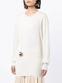 embellished crew-neck jumper cosmic latte virgin wool fine knit gold-tone hardware crew neck long sleeves Made in Italy Composition Body: Virgin Wool 100% SIZE & FIT Model measurements Height 5 ft 10 in(1.78 m) Bust/Chest 28.34 in(72 cm) Hips 35.43 in(90 cm) Waist 23.62 in(60 cm) FittingInformation This piece fits true to size. We recommend you get your regular size Cut for a loose fit Made with a mid-weight fabric Washing instructions Dry Clean Only