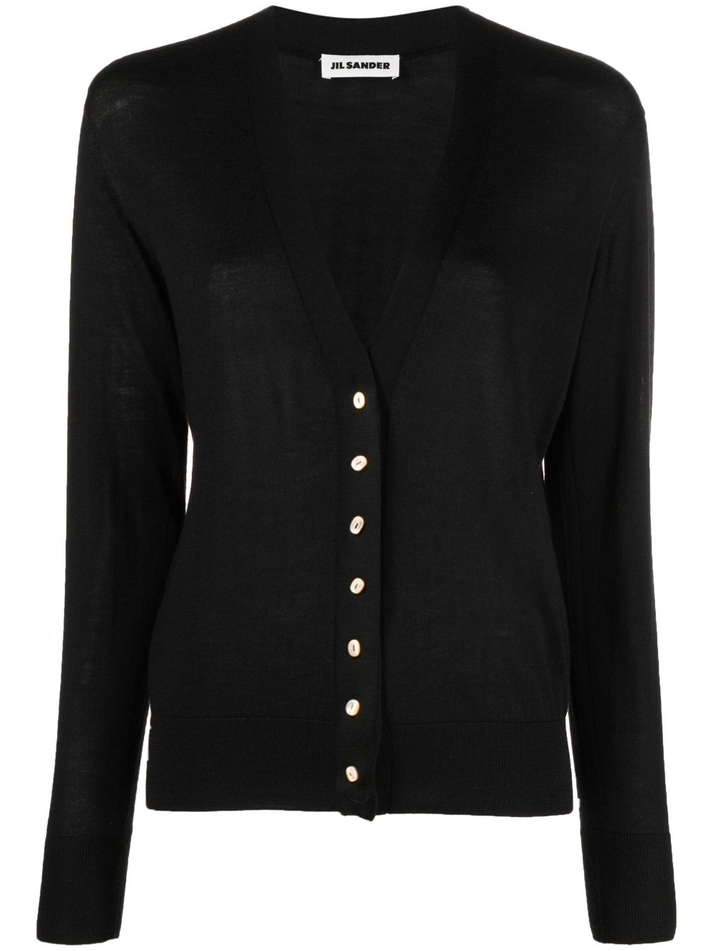 fine-knit V-neck cardigan Highlights - Black - Virgin wool-cashmere-silk blend - Fine knit - V-neck - Front button fastening - Long sleeves - Ribbed cuffs and hem - Straight hem Made in Italy Composition Cashmere 35%, Virgin Wool 35%, Silk 30% SIZE & FIT Model measurements Height 5 ft 10 in(1.77 m) Bust/Chest 33.07 in(84 cm) Hips 37 in(94 cm) Waist 24.8 in(63 cm) FittingInformation Designed for a relaxed fit, this piece allows for comfort and movement when worn Made with a lightweight knit, this piece offers some stretch This piece fits true to size – take your usual size Washing instructions Dry Clean Only