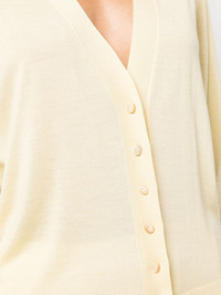fine-knit V-neck cardigan pastel yellow virgin wool-cashmere blend fine knit V-neck front button fastening ribbed cuffs and hem long sleeves straight hem Made in Italy Composition Cashmere 35%, Virgin Wool 35%, Silk 30% SIZE & FIT Model measurements Height 5 ft 10 in(1.78 m) Bust/Chest 33.07 in(84 cm) Hips 36.61 in(93 cm) Waist 24.8 in(63 cm) FittingInformation Designed for a relaxed fit, this piece allows for comfort and movement when worn Made with a lightweight knit, this piece offers some stretch This piece fits true to size – take your usual size Washing instructions Dry Clean Only