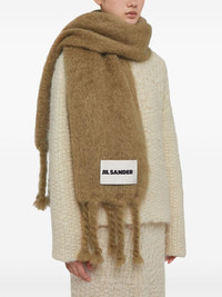 fringed brushed scarf Highlights - Light brown - Mohair-wool blend - Knitted construction - Brushed effect - Applique logo - Fringed edge - Rectangle shape - Wraparound style Imported Composition Mohair 73%, Wool 24%, Polyamide 3% SIZE & FIT Measurement LENGTH 69.29 in(176 cm) WIDTH 16.53 in(42 cm)