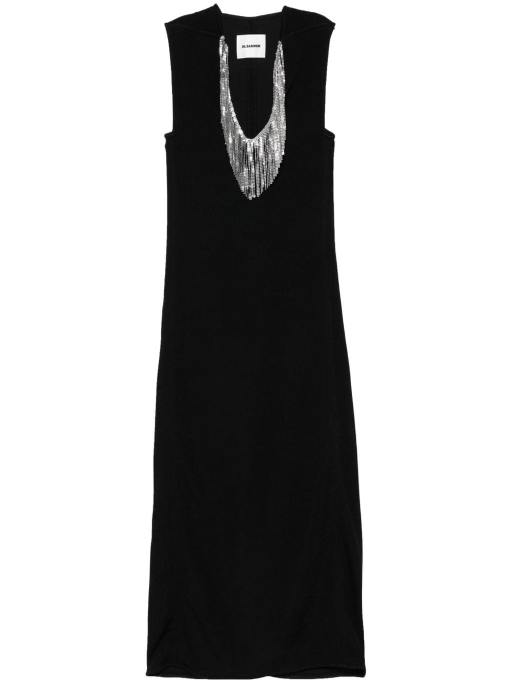 fringed-mesh maxi dress Highlights - Black - Textured finish - Plunge style - Fringe detailing - Mesh chain - Sleeveless - Central rear vent - Straight hem - Long length Made in Italy Composition Outer: Aluminium 100%, Viscose 62%, Polyamide 37%, Elastane 1% Lining: Viscose 100% SIZE & FIT Model measurements Height 5 ft 10 in(1.78 m) Bust/Chest 31.49 in(80 cm) Hips 37 in(94 cm) Waist 23.62 in(60 cm) FittingInformation Designed for a close fit throughout Made from a midweight stretch fabric, this piece offers elasticity and flexibility when worn