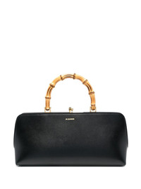 Goji bamboo-handle leather bag Highlighting Jil Sander's penchant for minimalist design, this Goji tote bag is suspended from a structured bamboo top handle. Designed in smooth black calf leather with an elongated silhouette, the rectangular piece is simply detailed with a gold-tone logo to its front. Made in Italy Composition Outer: Calf Leather 100% SIZE & FIT Model measurements Height 5 ft 10 in(1.77 m) Bust/Chest 32.28 in(82 cm) Hips 35.03 in(89 cm) Waist 25.19 in(64 cm) Measurement DEPTH 3.14 in(8 cm) HEIGHT 7.08 in(18 cm) WIDTH 7.87 in(20 cm)