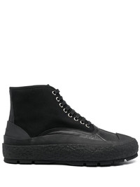 hi-top sneakers black cotton logo patch at the tongue ankle-length front lace-up fastening textured finish Imported Composition Outer: Cotton 100%, Calf Leather 100% Lining: Calf Leather 100% Sole: Rubber 100% SIZE & FIT Measurement HEEL 0.98 in(2.5 cm) HEIGHT 5.11 in(13 cm) Sole height 0.78 in(2 cm)