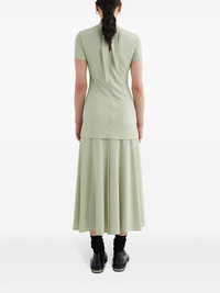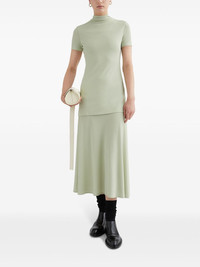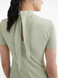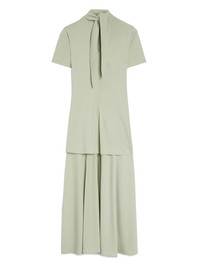 high-neck fluid midi dress Highlights - Mint green - Crepe texture - Fluid - High neck - Rear tie fastening - Short sleeves - Flared skirt - Keyhole detail to the rear - Straight hem - Mid-calf length Made in Italy Composition Viscose 82%, Polyamide 18%