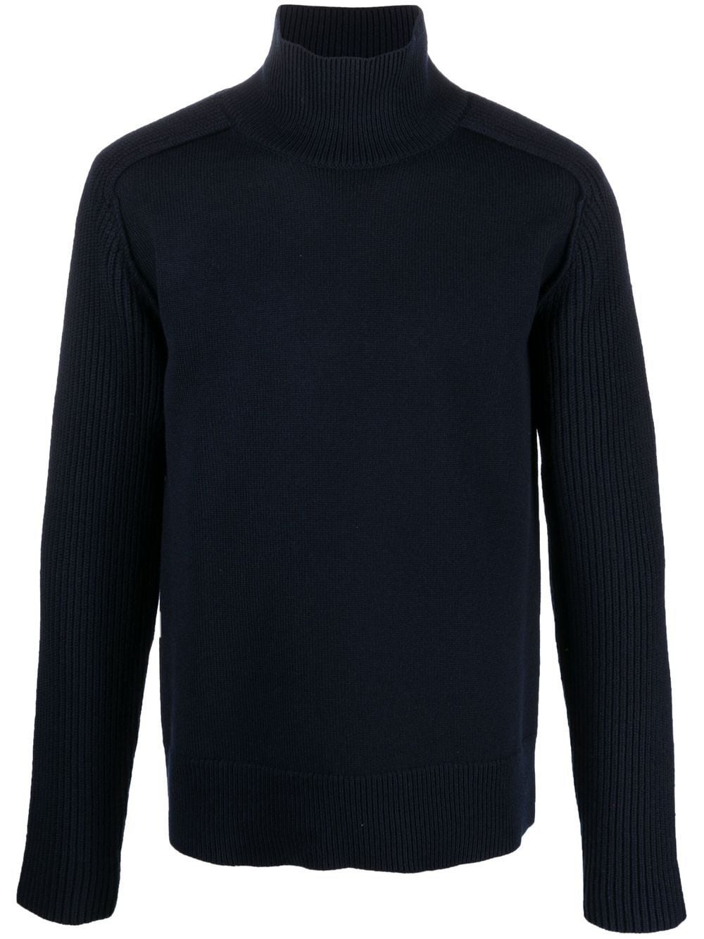 high-neck wool jumper midnight blue wool ribbed knit high neck long sleeves straight hem Made in Italy Composition Wool 100% SIZE & FIT Model measurements Height 6 ft 2 in(1.87 m) Bust/Chest 36.41 in(92.5 cm) Hips 37 in(94 cm) Waist 29.52 in(75 cm) FittingInformation This piece fits true to size. We recommend you get your regular size Cut for a relaxed fit Made with a mid-weight fabric Washing instructions Dry Clean Only