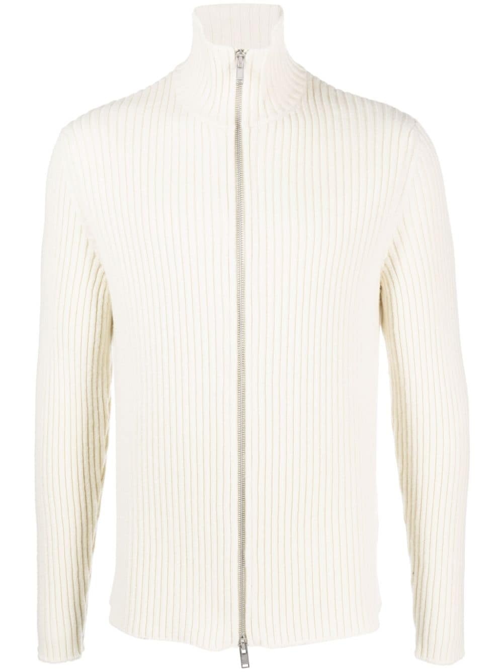 high-neck zip-up cardigan Highlights - Cream white - Wool - Chunky ribbed knit - High neck - Front two-way zip fastening - Long sleeves - Straight hem Made in Italy Composition Wool 100% SIZE & FIT Model measurements Height 6 ft 2 in(1.87 m) Bust/Chest 36.41 in(92.5 cm) Hips 35.43 in(90 cm) Waist 29.52 in(75 cm) FittingInformation Designed for a slim fit, offering a comfortable fit that sits just away from the body Made with a midweight knit, this piece offers some stretch This piece fits true to size – take your usual size Measurement CHEST 34.64 in(88 cm) SLEEVE LENGTH 26.37 in(67 cm) LENGTH 27.16 in(69 cm) Washing instructions Dry Clean Only