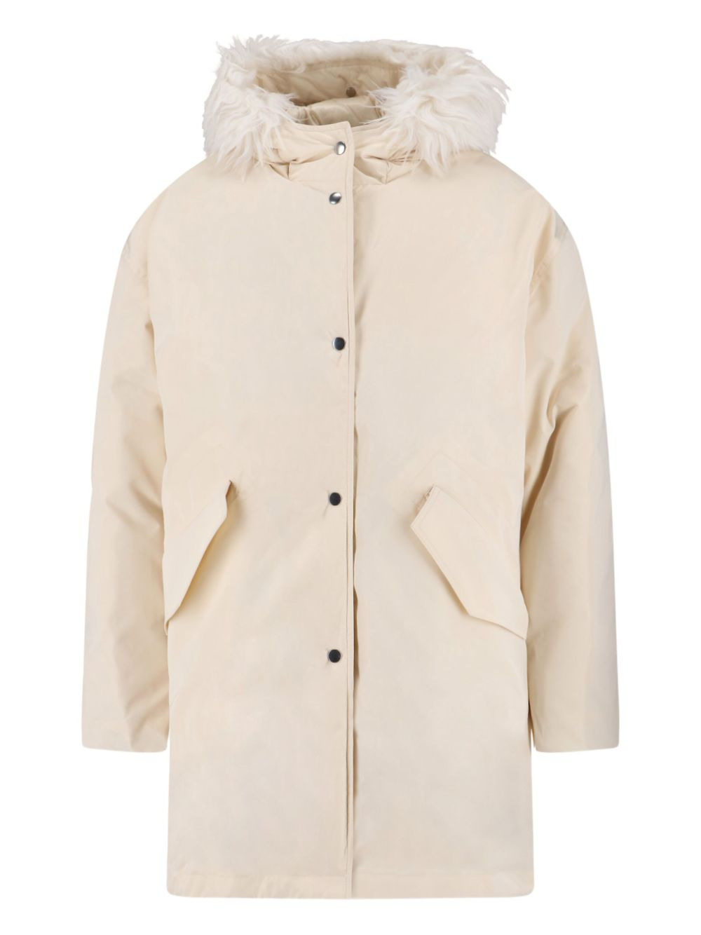 hooded parka coat Highlights - Off-white - Trimmed hood - Snap button fastening - Flap pockets - Straight hem Made in Italy Composition Outer: Polyamide 100%, Polyester 100% Lining: Goose Down 85%, Goose Feather 15% Washing instructions Read Manufacturer Guidelines
