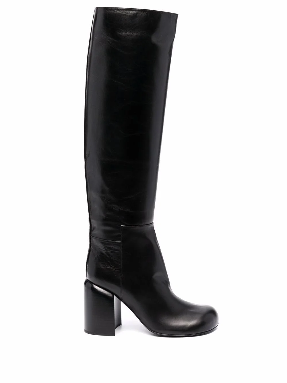 knee-length high-heel leather boots black leather knee-length slip-on style round toe high block heel Made in Italy Composition Lining: Leather 100% Outer: Leather 100% Sole: Leather 100% SIZE & FIT Measurement HEEL 3.74 in(9.5 cm) HEIGHT 17.32 in(44 cm)