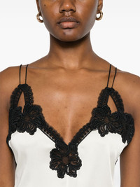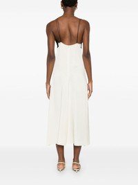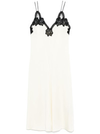 lace-trimmed midi dress Highlights - Light beige - Concealed rear zip fastening - Spaghetti straps - V-neck - Straight hem Made in Italy Composition Polyester 100%, Acetate 74%, Viscose 26% SIZE & FIT Model measurements Height 5 ft 10 in(1.77 m) Bust/Chest 34.64 in(88 cm) Hips 35.43 in(90 cm) Waist 24.8 in(63 cm) FittingInformation Designed for a slim fit that sits just away from the body offering a close yet comfortable fit Made from a midweight non-stretch fabric This piece fits small – take one size up