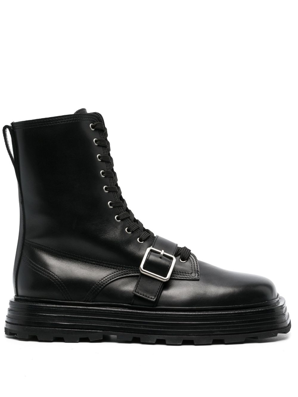 lace-up leather ankle boots Highlights - Black - Calf leather - Panelled design - Silver-tone hardware - Square toe - Front lace-up fastening - Buckle-strap fastening - Ankle-length - Pull-tab at the heel - Chunky rubber sole Made in Italy Composition Outer: Leather 100% Lining: Calf Leather 100%