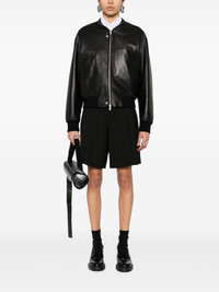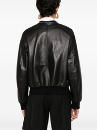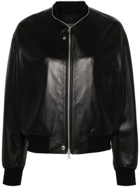 leather bomber jacket Highlights - Black - Lambskin - Nappa leather - Flat round collar - Drop shoulder - Long sleeves - Ribbed cuffs and hem - Two side welt pockets - Internal logo tag - Internal jetted pocket - Full lining - Straight hem - Front two-way zip fastening Made in Italy Composition Lining: Viscose 100%, Cotton 100% Outer: Lamb Skin 100% SIZE & FIT Model measurements Height 5 ft 9 in(1.76 m) Bust/Chest 31.88 in(81 cm) Hips 35.43 in(90 cm) Waist 24.8 in(63 cm) FittingInformation Designed for a relaxed fit, this piece allows for comfort and movement when worn The ribbed hem offers a close, comfortable fit Soft leather has a supple and smooth construction offering some flexibility This piece fits true to size – take your usual size Measurement SLEEVE LENGTH 23.5 in(59.7 cm) LENGTH 22 in(55.9 cm) WAIST 40 in(101.6 cm) BUST 45.98 in(116.8 cm) Washing instructions Specialist Cleaning