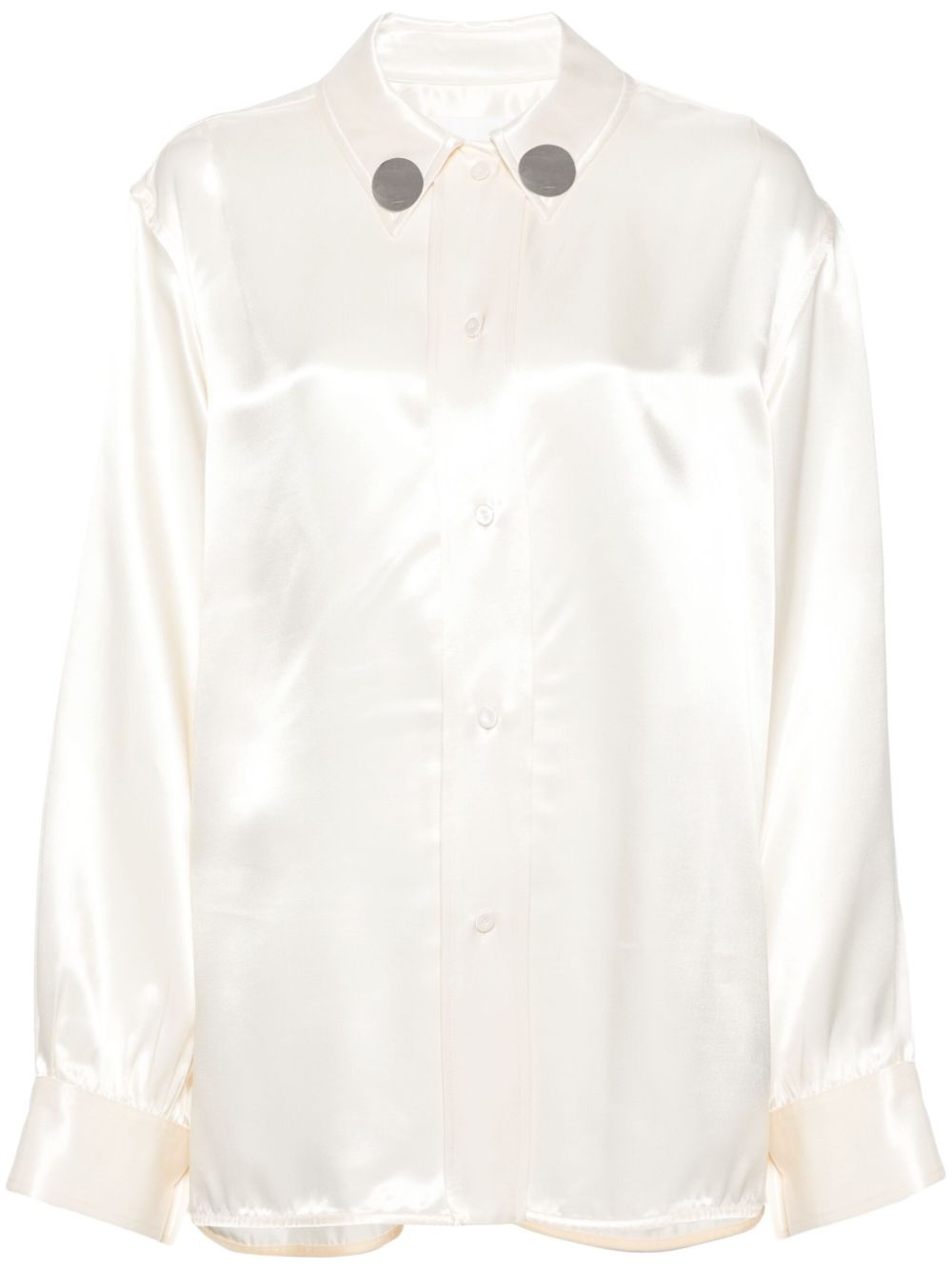 logo-applique drop-shoulder shirt Highlights - Ivory white - Satin weave - Applique logo - Pointed flat collar - Front button fastening - Drop shoulder - Long sleeves - Buttoned cuffs - Straight hem Made in Italy Composition Viscose 67%, Cupro 33% SIZE & FIT Model measurements Height 5 ft 10 in(1.78 m) Bust/Chest 32.67 in(83 cm) Hips 35.43 in(90 cm) Waist 23.22 in(59 cm) FittingInformation Designed to be unstructured, offering a loose fit throughout Made from a midweight non-stretch fabric This piece fits true to size – take your usual size