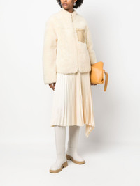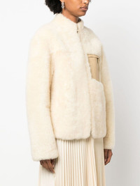 logo-embossed shearling jacket Highlights - Beige - Cotton/lambs wool - Shearling - Embossed logo to the front - Zip-fastening chest pocket - Long sleeves - Front zip fastening - Straight hem Made in Italy Composition Lining: Cotton 100% Outer: Lamb Fur 100% SIZE & FIT Model measurements Height 5 ft 11 in(1.8 m) Bust/Chest 31.49 in(80 cm) Hips 35.82 in(91 cm) Waist 24.8 in(63 cm) FittingInformation Designed to be unstructured, offering a loose fit throughout Firm shearling has a treated construction offering some durability This piece fits true to size – take your usual size Washing instructions Dry Clean Only