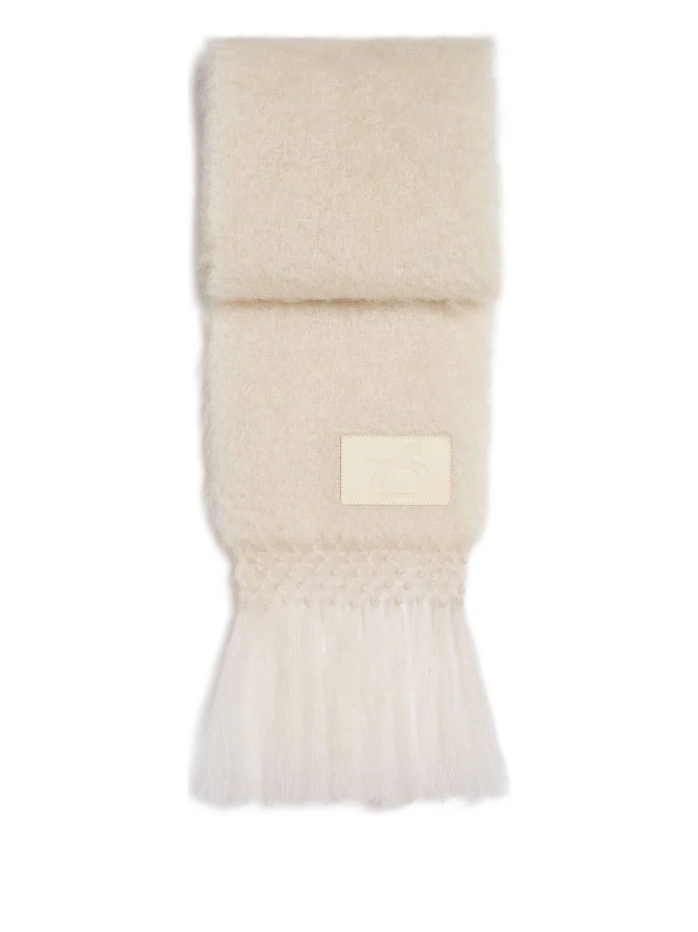 logo-patch fringed scarf Highlights - Off-white - Embossed horse symbol - Fringed hem - Leather patch Made in Italy Composition Mohair 73%, Wool 24%, Polyamide 3% Washing instructions Read Manufacturer Guidelines