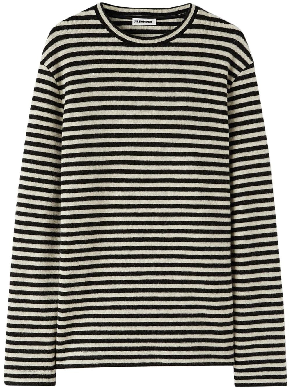 striped wool sweater Highlights - Ivory white/jet black - Wool - Horizontal stripe pattern - Logo patch to the rear - Round neck - Drop shoulder - Long sleeves - Straight hem Made in Italy Composition Lining: Cotton 100% Outer: Wool 100% SIZE & FIT FittingInformation Designed for a relaxed fit, this piece allows for comfort and movement when worn Made with a midweight knit, this piece offers some stretch Washing instructions Read Manufacturer Guidelines