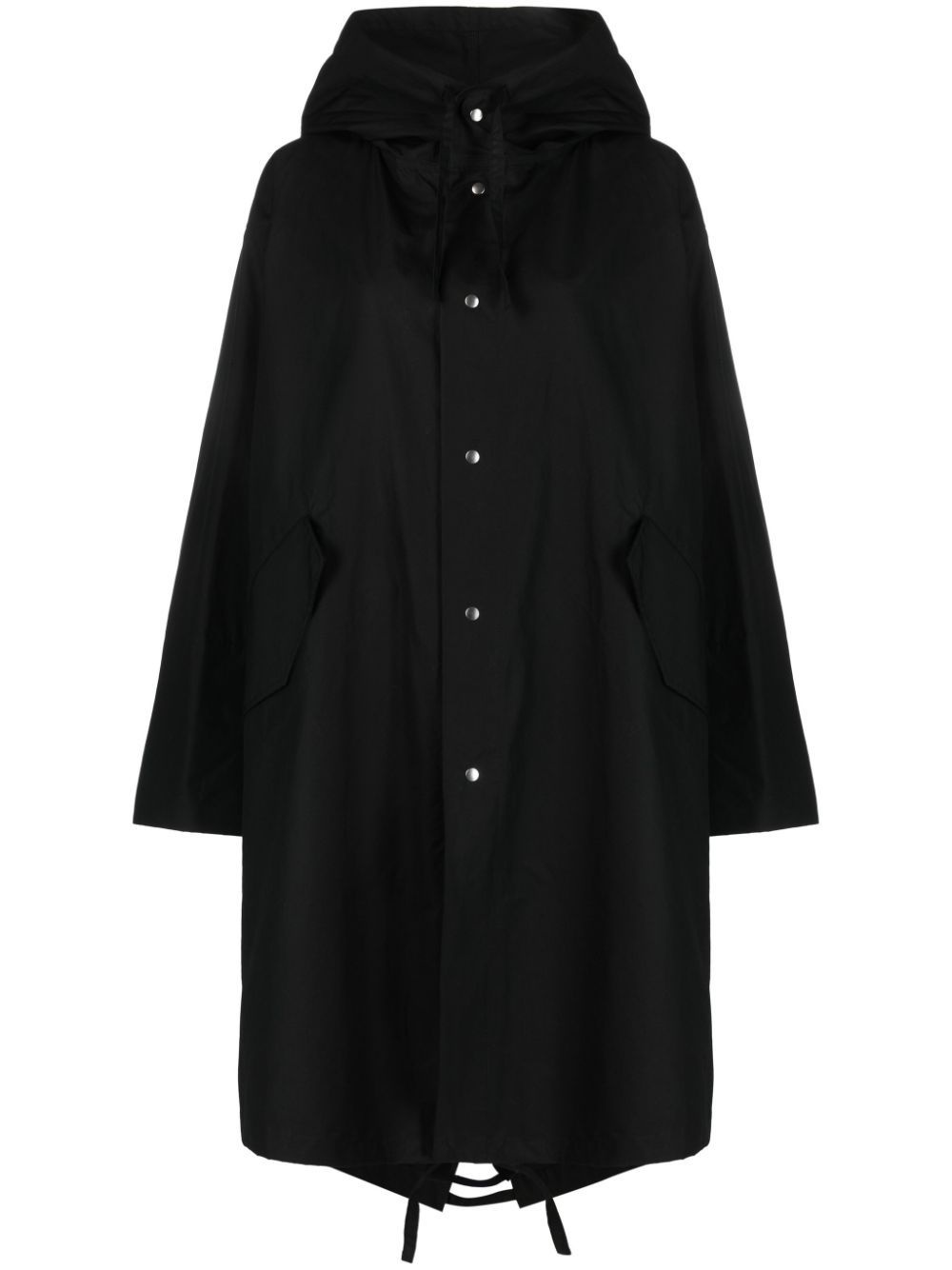 logo-print cotton coat Highlights - Black - Cotton - Logo print to the rear - Classic hood - Stand-up collar - Front press-stud fastening - Two side flap pockets - Long sleeves - High-low hem - Mid-length Made in Italy Composition Cotton 100% SIZE & FIT FittingInformation Designed for an oversized fit, offering additional room throughout The adjustable drawstring means that you can adjust this piece’s fit to suit your comfort and preference This piece fits true to size – take your usual size Washing instructions Dry Clean Only