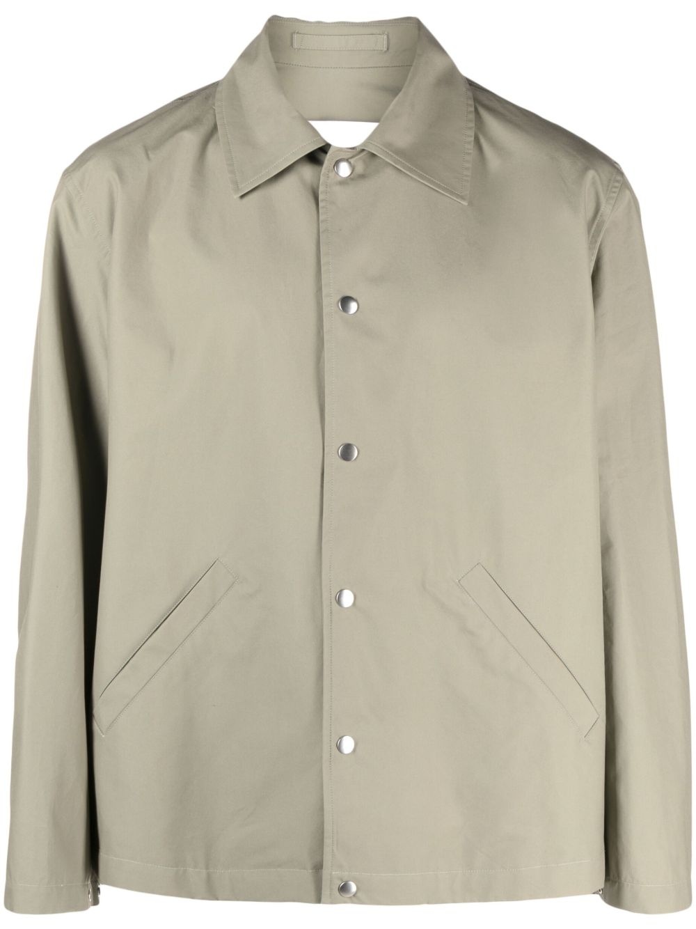 logo-print cotton shirt jacket Highlights - Light olive green - Cotton - Logo print to the rear - Classic collar - Long sleeves - Front press-stud fastening - Two diagonal pockets to the sides - Straight hem Made in Italy Composition Outer: Cotton 100% Lining: Cotton 100% SIZE & FIT Model measurements Height 6 ft 2 in(1.88 m) Bust/Chest 35.03 in(89 cm) Hips 35.82 in(91 cm) Waist 27.95 in(71 cm) FittingInformation Designed for a boxy fit, intended for a loose fit throughout Made from a midweight non-stretch fabric This piece fits true to size – take your usual size Washing instructions Dry Clean Only