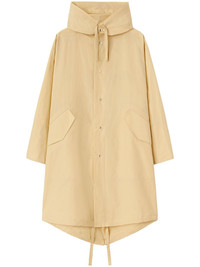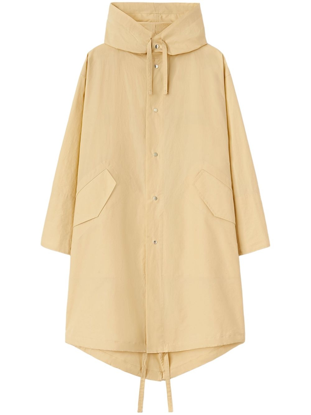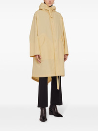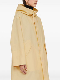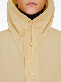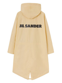 logo print drawstring coat Benefiting from water-repellent properties and a hood for added coverage, this pastel yellow coat from Jil Sander taps into both functionality and style. Italy-made, its oversized silhouette can be adjusted thanks to a drawstring waist whilst a contrasting logo adorns the front. Made in Italy Composition Cotton 100% SIZE & FIT FittingInformation Designed for an oversized fit, offering additional room throughout The adjustable drawstring means that you can adjust this piece’s fit to suit your comfort and preference Made from a midweight non-stretch fabric This piece fits true to size – take your usual size Washing instructions Dry Clean Only