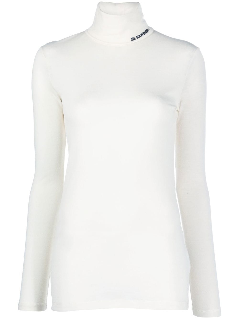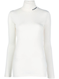 logo-print roll-neck top Jil Sander's signature minimalist design style is showcased on this long-sleeve top, which features a logo-print at the neck in an eye-catching contrasting colourway. Made in Italy Composition Polyester 55%, Virgin Wool 45% SIZE & FIT Model measurements Height 5 ft 11 in(1.8 m) Bust/Chest 32.67 in(83 cm) Hips 36.22 in(92 cm) Waist 24.4 in(62 cm) FittingInformation Designed for a slim fit that sits just away from the body offering a close yet comfortable fit Made from a lightweight non-stretch fabric, this piece offers minimal elasticity when worn This piece fits true to size – take your usual size Washing instructions Dry Clean Only