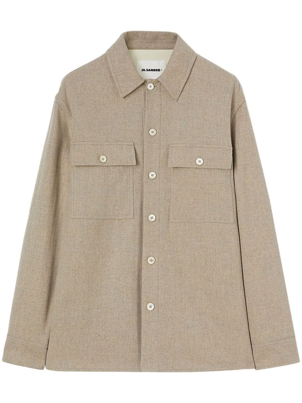 long-sleeve flannel shirt Highlights - Sesame beige - Virgin wool - Flannel - Melange effect - Spread collar - Front button fastening - Drop shoulder - Long sleeves - Buttoned cuffs - Two chest flap pockets - Straight hem Made in Italy Composition Virgin Wool 100% SIZE & FIT FittingInformation Designed for a relaxed fit, this piece allows for comfort and movement when worn Made from a midweight non-stretch fabric