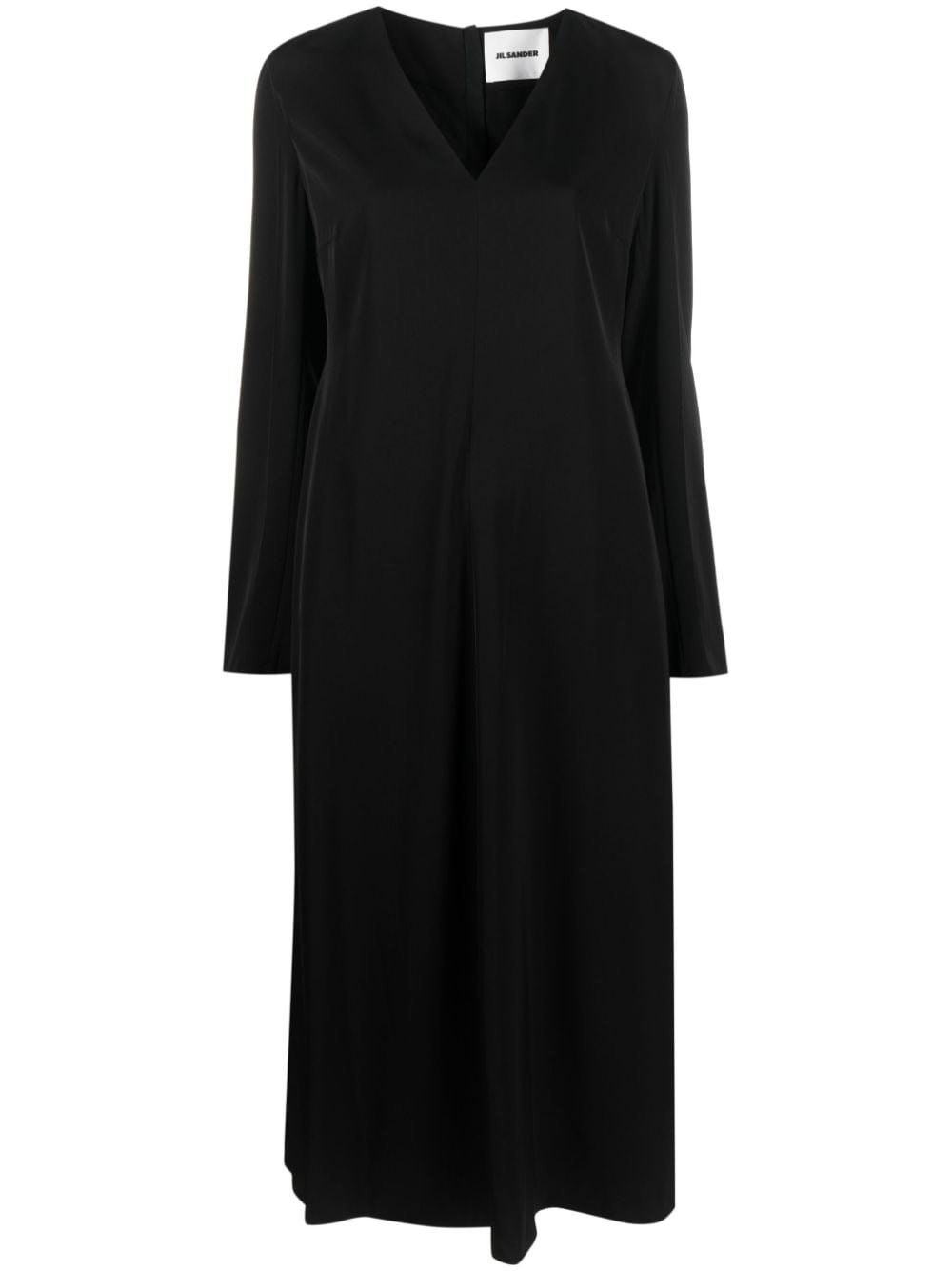 long-sleeve midi dress Favouring understated designs, Jil Sander introduces this midi dress in a timeless black. Its effortless silhouette drapes delicately, embodying a sense of refined elegance. Highlights - Black - Stretch-design - V-neck - Rear zip fastening - Long sleeves - Straight hem - Calf-length Made in Italy Composition Lining: Viscose 95%, Spandex/Elastane 5% Outer: Viscose 100% SIZE & FIT Model measurements Height 5 ft 11 in(1.8 m) Bust/Chest 34.25 in(87 cm) Hips 35.82 in(91 cm) Waist 24.8 in(63 cm) Washing instructions Read Manufacturer Guidelines