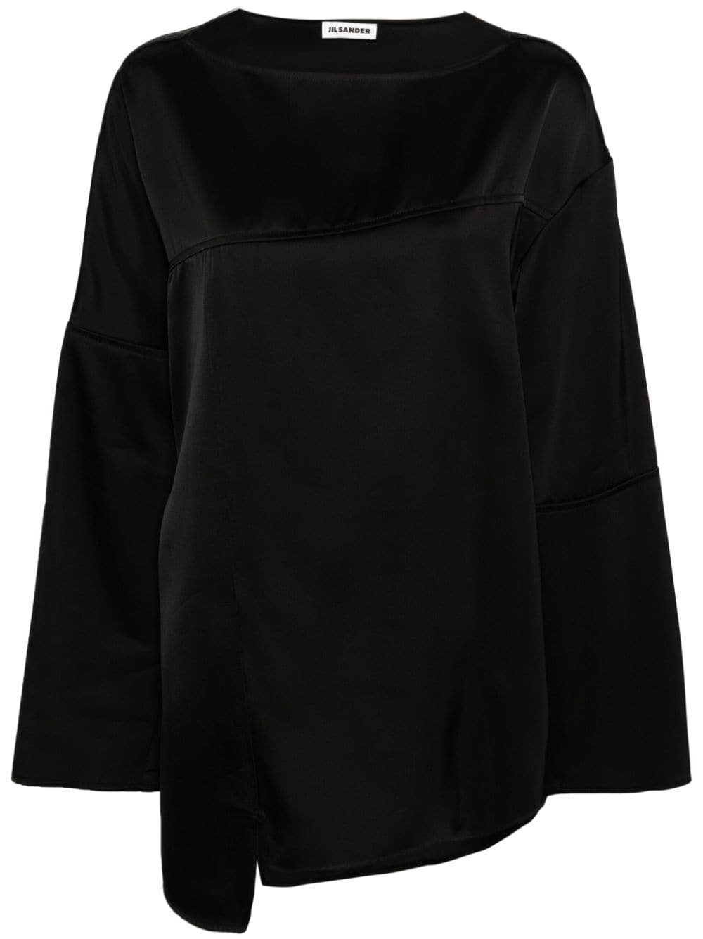 long-sleeve panelled shirt Perfectly channelling Jil Sander's minimalistic aesthetic, this black blouse offers a classic long-sleeved design and is simply elevated by an asymmetric hem. Highlights - Black - Gabardine weave - Panelled design - Asymmetric design - Round neck - Long sleeves - Three off-centre short vents - Asymmetric hem Made in Italy Composition Viscose 83%, Silk 17% SIZE & FIT Model measurements Height 5 ft 10 in(1.77 m) Bust/Chest 34.64 in(88 cm) Hips 35.43 in(90 cm) Waist 24.8 in(63 cm) FittingInformation Designed to be unstructured, offering a loose fit throughout Made from a midweight non-stretch fabric This piece fits true to size – take your usual size
