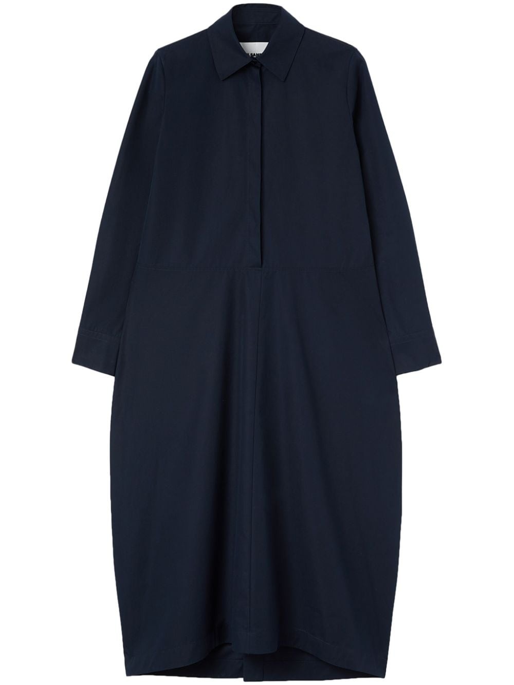long-sleeved organic cotton shirtdress Highlights - Navy blue - Cotton - Poplin texture - Classic collar - Concealed front button fastening - Long sleeves - Buttoned cuffs - Two side inset pockets - High-low hem - Mid-length Made in Italy Composition Cotton 100% SIZE & FIT Measurement SLEEVE LENGTH 24.4 in(62 cm) HIPS 47.63 in(121 cm) LENGTH 44.88 in(114 cm) WAIST 38.58 in(98 cm) FittingInformation The vented hem offers movement at the rear Made from a heavyweight non-stretch fabric This piece fits true to size – take your usual size Washing instructions Read Manufacturer Guidelines