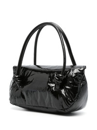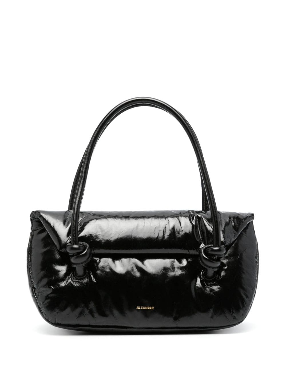 padded leather shoulder bag Explorations of form and function reign supreme at Jil Sander. A case in point, this black shoulder bag is crafted from glossy, wrinkle-effect calf leather to a padded silhouette with rounded lines. Knotted top handles circle back to the style name, as a gold-tone logo stamp adds a final branded note. Highlights - Core black - Calf leather - High-shine detailing - Rectangle shape - Padded design - Two top handles with knot detailing - Foldover top - Embossed logo to the front - Main compartment - Internal zip-fastening pocket - Embossed internal logo - Leather lining - Gold-tone hardware - Concealed magnetic fastening Made in Italy Composition Lining: Calf Leather 100% Outer: Calf Leather 100% SIZE & FIT Model measurements Height 5 ft 11 in(1.8 m) Bust/Chest 32.67 in(83 cm) Hips 36.22 in(92 cm) Waist 24.4 in(62 cm) Measurement DEPTH 4.33 in(11 cm) HEIGHT 5.11 in(13 cm) STRAP 5.51 in(14 cm) WIDTH 10.62 in(27 cm)