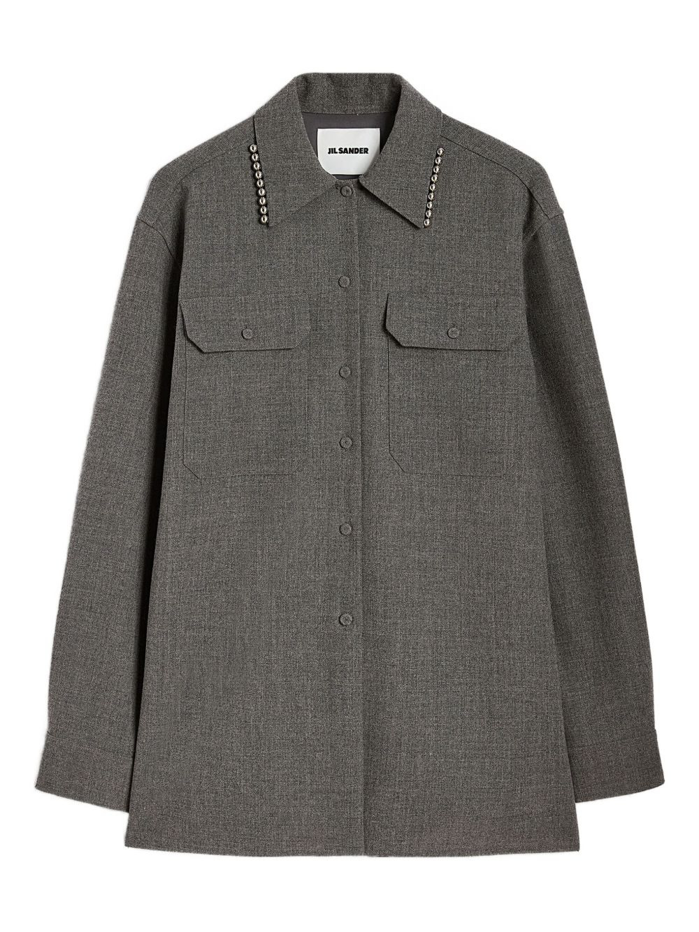 pearl-embellished button-up shirt Highlights - Grey - Pearl detailing at collar - Dual front pockets - Button fastening Made in Italy Composition Wool 100% Washing instructions Read Manufacturer Guidelines