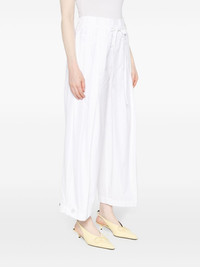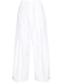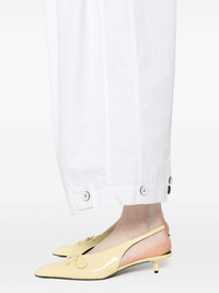 poplin cotton trousers Highlights - White - Organic cotton - Poplin texture - Pleat detailing - Pressed crease - Elasticated drawstring waistband - Two side inset pockets - Two rear patch pockets - Buttoned cuffs Made in Italy Composition Organic Cotton 100% SIZE & FIT Model measurements Height 5 ft 9 in(1.75 m) Bust/Chest 34.64 in(88 cm) Hips 36.61 in(93 cm) Waist 26.37 in(67 cm) FittingInformation Designed for a straight-leg fit, these trousers allow for a close fit at the waist and an unrestricted, comfortable fit over the leg The adjustable tabs allow for fitted preferences Made from a midweight non-stretch fabric This piece fits true to size – take your usual size