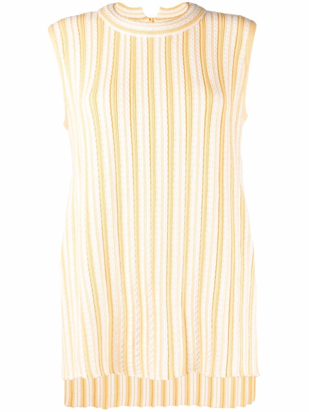 rib-knit sleeveless top Jil Sander diverts from their usual minimalist colour palette to present this sleeveless knit top, presented in a two-tone striped design. Made in Italy Composition Cotton 95%, Polyamide 4%, Spandex/Elastane 1% SIZE & FIT Model measurements Height 5 ft 10 in(1.78 m) Bust/Chest 33.07 in(84 cm) Hips 35.82 in(91 cm) Waist 25.98 in(66 cm) FittingInformation This piece fits true to size. We recommend you get your regular size Cut for a loose fit Made with a mid-weight stretch fabric Washing instructions Dry Clean Only